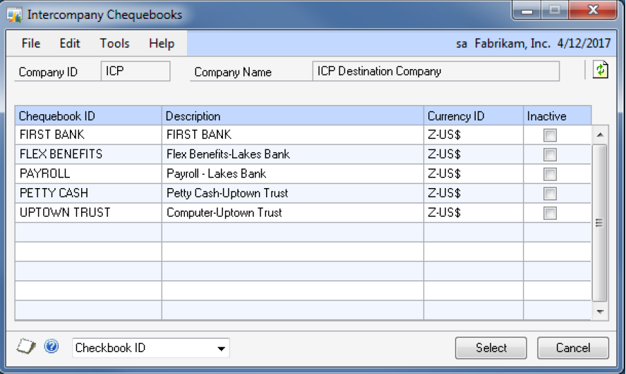 - Select the Checkbook ID from the Destination Company’s list of Checkbooks.