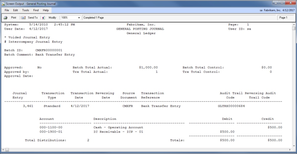 - The relevant CMXFR batch will auto-post to the GL (in GP 10, GP2010 and GP2013) using the GP Posting Options. It auto-posting is not setup, then the CMXFR batch will need to be posted in the Financial series posting to create the ICP journals in the destination company.