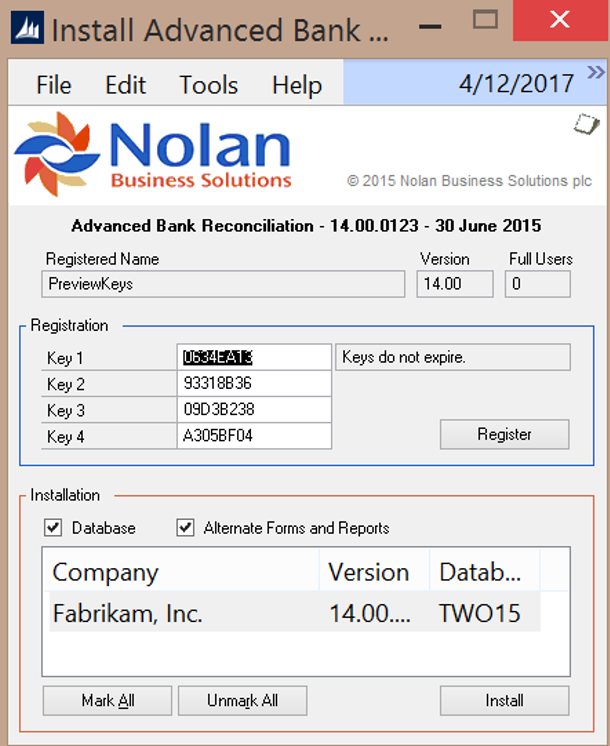 - To register Advanced Bank Reconciliation, enter the four 8-Digit Registration Keys in the fields provided by Nolan. (You will have received these Registration Keys with your purchase of Advanced Bank Reconciliation). This is required to enable use of Advanced Bank Reconciliation in companies other than the sample company ‘Fabrikam, Inc’.