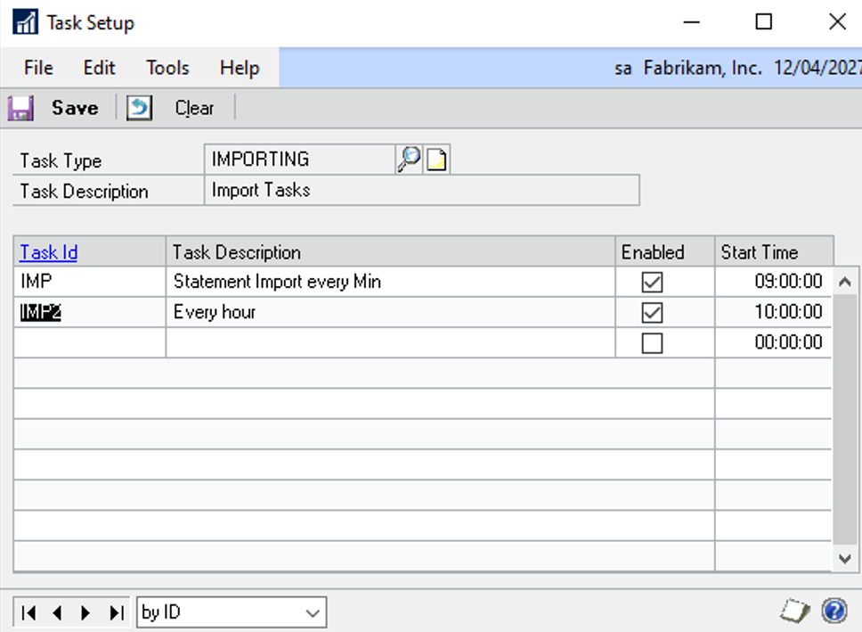 Tools >> Utilities >> Financial >> Advanced Bank Reconciliation >> Task Scheduler >> Setup >> Setup