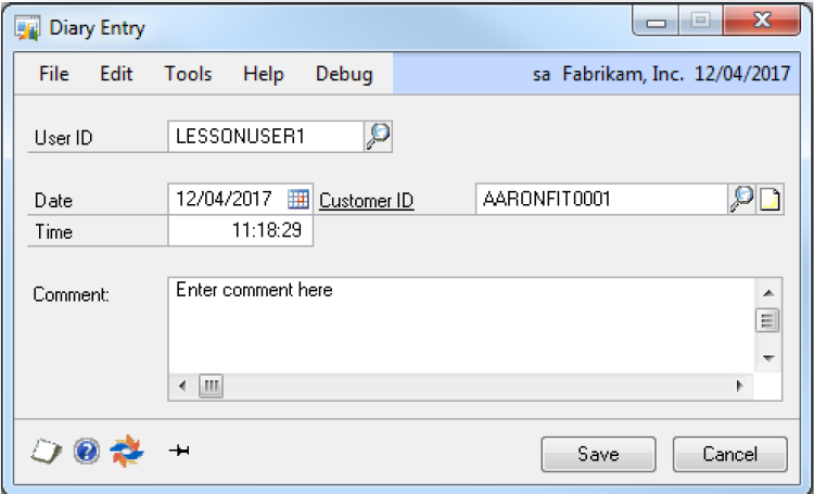 Each diary item is shown in the scrolling window, which can be sorted by date, customer and user ID. The items can be restricted to a specific user ID. To update the details of an item, zoom on the comment field to open the entry screen. New items are created using the ‘Enter Item’ button.
