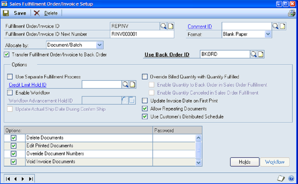 The Allow Repeating Documents checkbox behaves in the same way as on the standard Sales Quote Setup and Sales Order Setup windows. This means that an Invoice ID that you want to allow repeating for must be Allocated By Document/Batch.