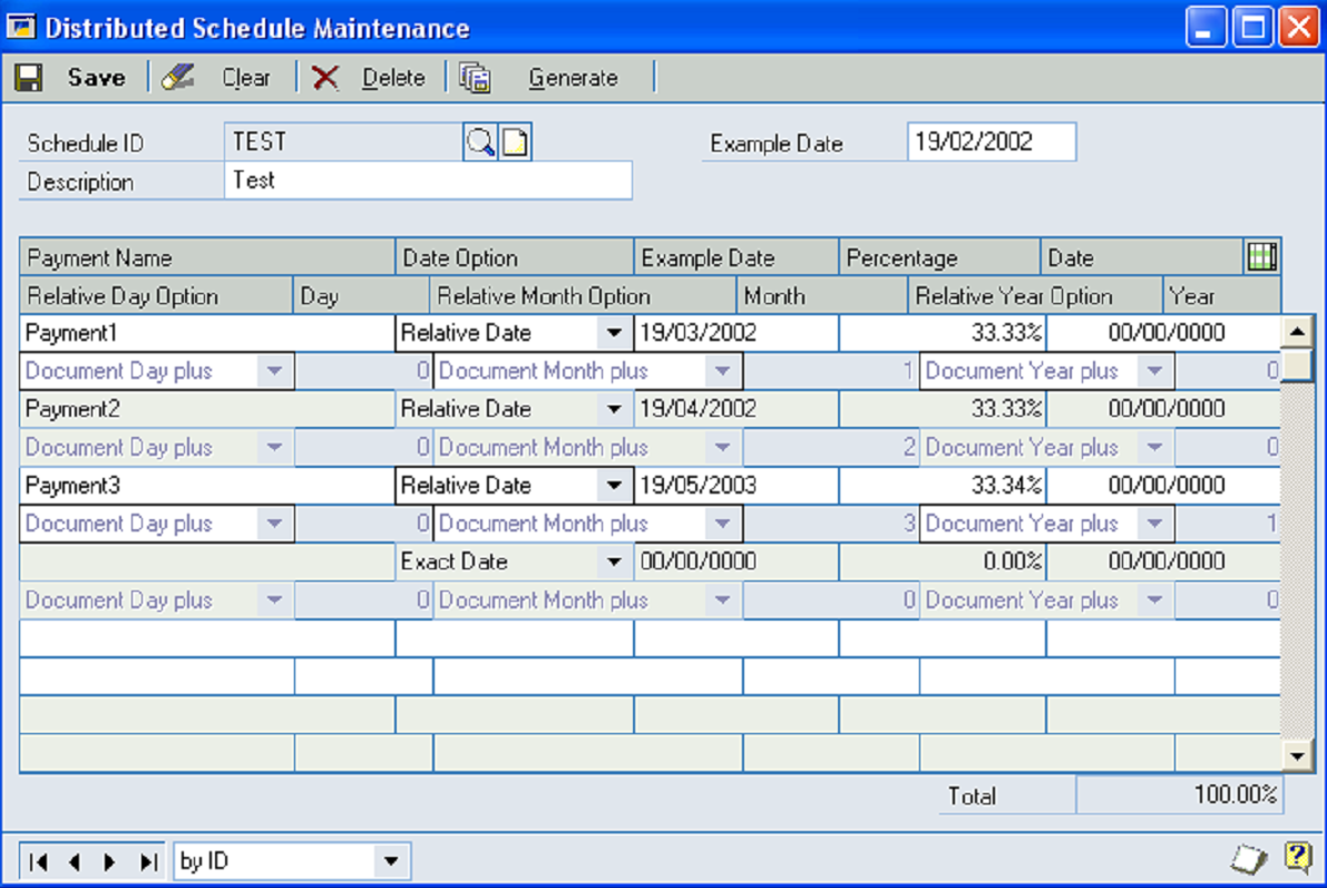 Invoices which are distributed can have a schedule which defines the exact dates and amounts for each instalment. The Distributed Schedule Maintenance window allows templates for those schedules to be defined.