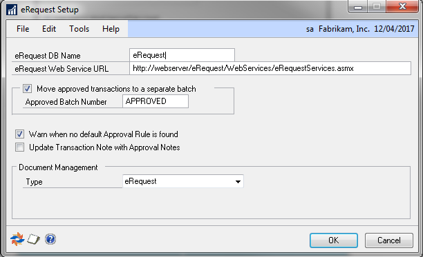 In Tools >> Setup >> Purchasing >> eRequest, the module adds three new setup windows