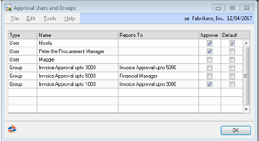 Can change invoice during approval – once the invoice has been sent for approval, giving this access to the user will allow that user to change the invoice in Dynamics GP even though the user that is approving the invoice may not be aware of the change occurring. If this option is not set, the invoice in Dynamics GP will be set as read only for the user.