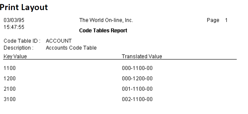 This report is produced by selecting Print from the File menu when within the Code Table Maintenance window.