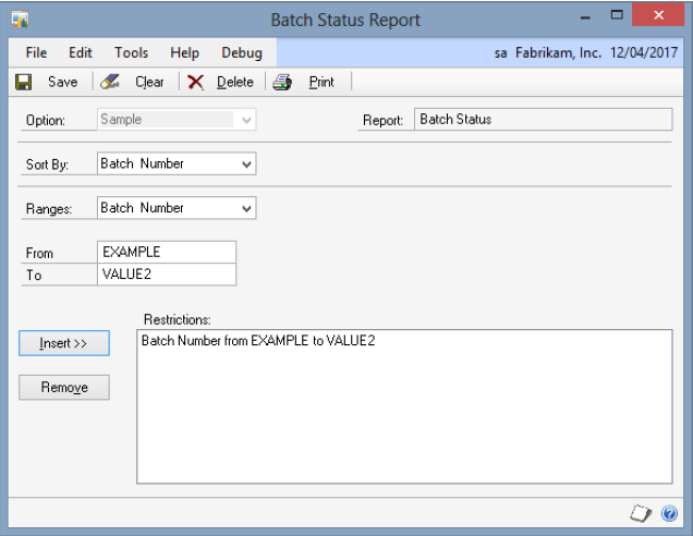 Range restrictions can be defined for the report by selecting a field from the Ranges drop-down list, entering the From/To values, and using the ‘Insert >>’ button to add the range to the restrictions list.