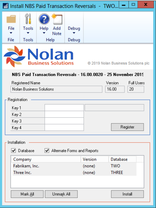 - To register Paid Transaction Reversals, enter your Registration Keys in the fields provided (You will have received these Registration Keys with your purchase of Paid Transaction Reversals). This is required to enable use of Paid Transaction Reversals in companies other than the sample company, ‘Fabrikam, Inc.’.