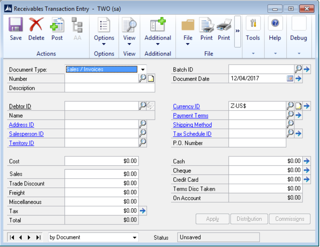 If the user selected to install to Receivables Management at install time, then the RM Sales Transaction is used to process collections. The Receivables Transaction Entry window is used to enter RM Sales Transactions. This window is unmodified as the standard transactions are used to generate the RM cash transactions. With the Install to Receivables Management option set at install time, the collection processing window will read through all Receivables Management Sales Transactions with a due date within the date range entered. The system will generate a batch of cash receipts for the customers and documents specified and where the customer has the Electronic collections option set on the Customer Card. The posting process on the cash batch will create an output file formatted to be processed through the customers banking software.