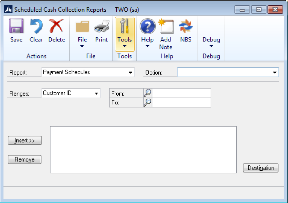The Scheduled Cash Collection Schedules report will accept a range of Customer Ids and Document numbers