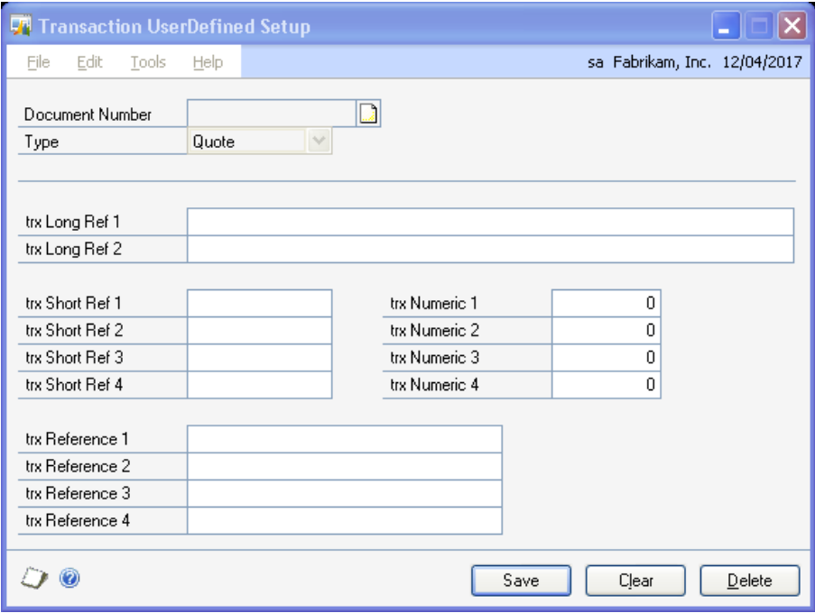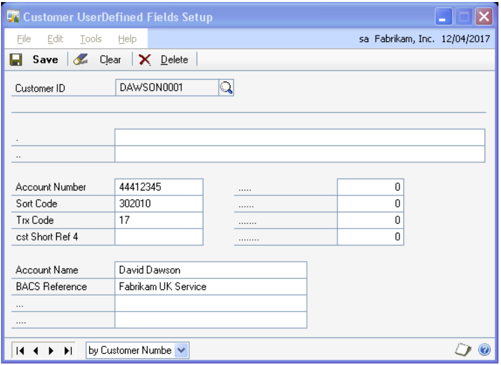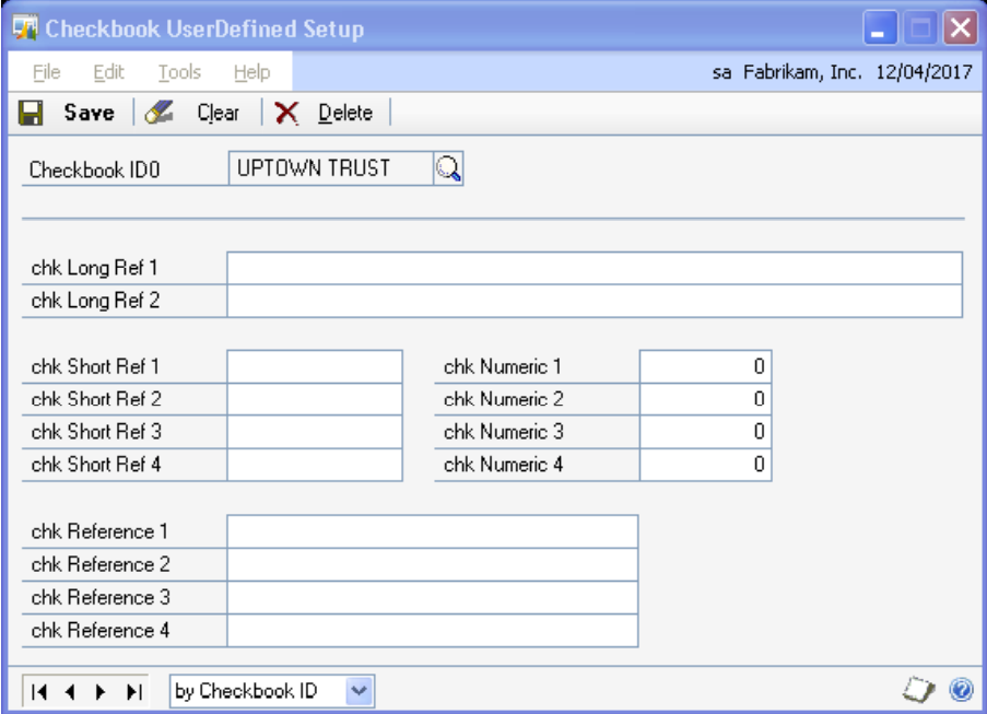 This windows are fairly basic in there operation. The Chequebook ID that you want should already be selected because you the information was passed from the main screen when you selected this option from the extras menu. Once you have typed in the information you wish to have in the user defined fields then you can save the record and return to the main screen from which you came. The clear and delete buttons work as per standard Microsoft Dynamics GP. I.e. the clear button clears the screen and the delete button deletes the record.