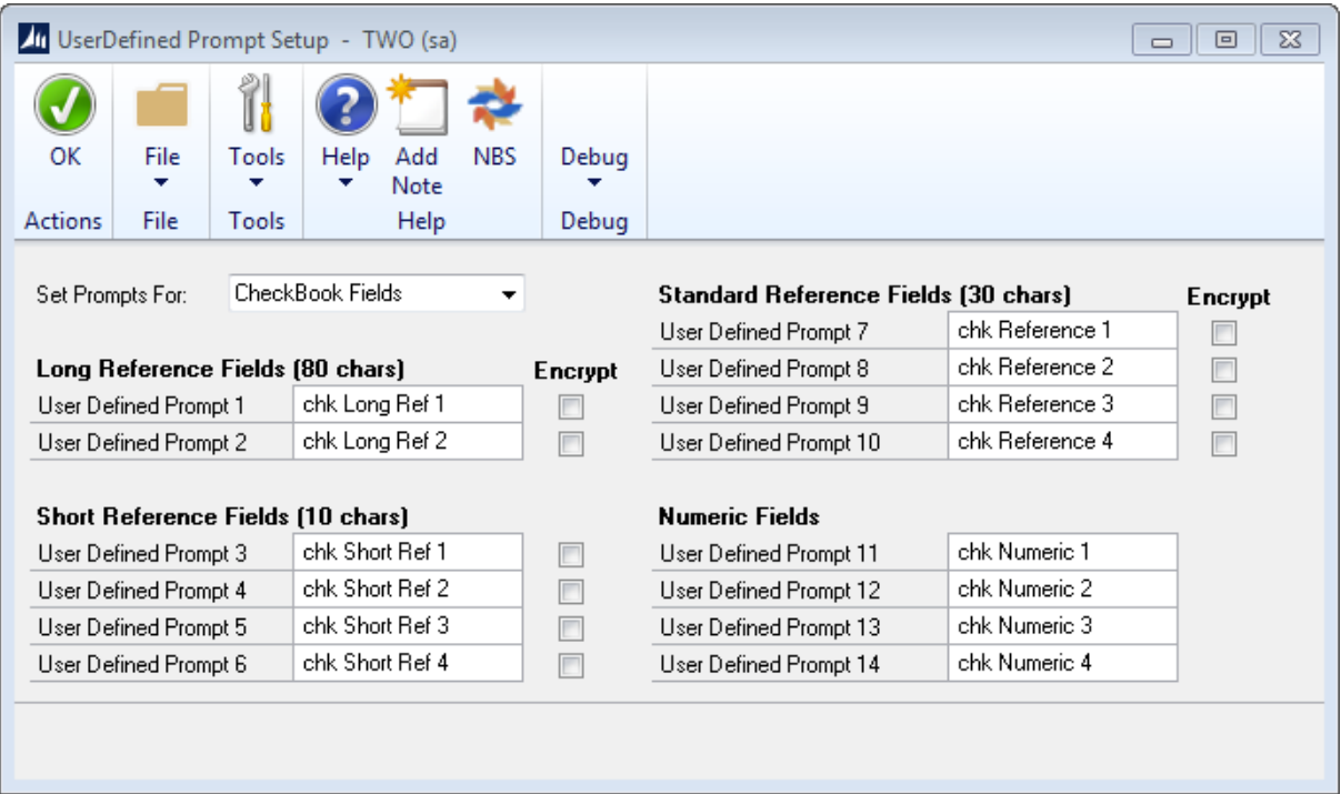 The User defined prompt window allows you to setup the names of your user defined prompts for customers, chequebooks and for transactions.