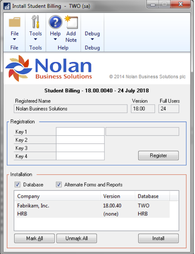 - To register Student Billing, enter the four 8-Digit Registration Keys in the fields provided by Nolan Business Solutions.(You will have received these Registration Keys with your purchase of Student Billing).This is required to enable use of Student Billing in companies other than the sample company “Fabrikam, Inc”. Note: The registration keys may have a built in expiration date. This information is displayed in the field to the right of Key 1.