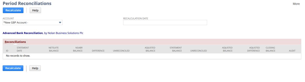 This will open the Period Reconciliations window where you will need to select the Account you want to use. Once you have done this, click Recalculate. This will Update Balances if there have been any Changes in any NetSuite Transactions. You can also enter a Recalculation Date to set where you want balances to be Recalculated from.