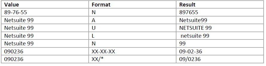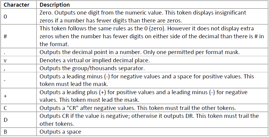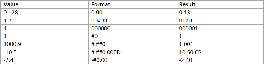 The following table shows the results of various numeric formats used on different values:
