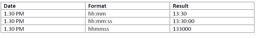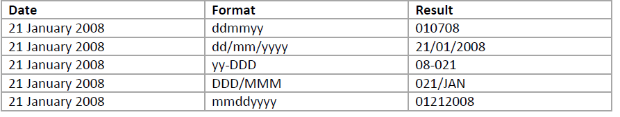 The following table shows the results of various date formats used on different values: