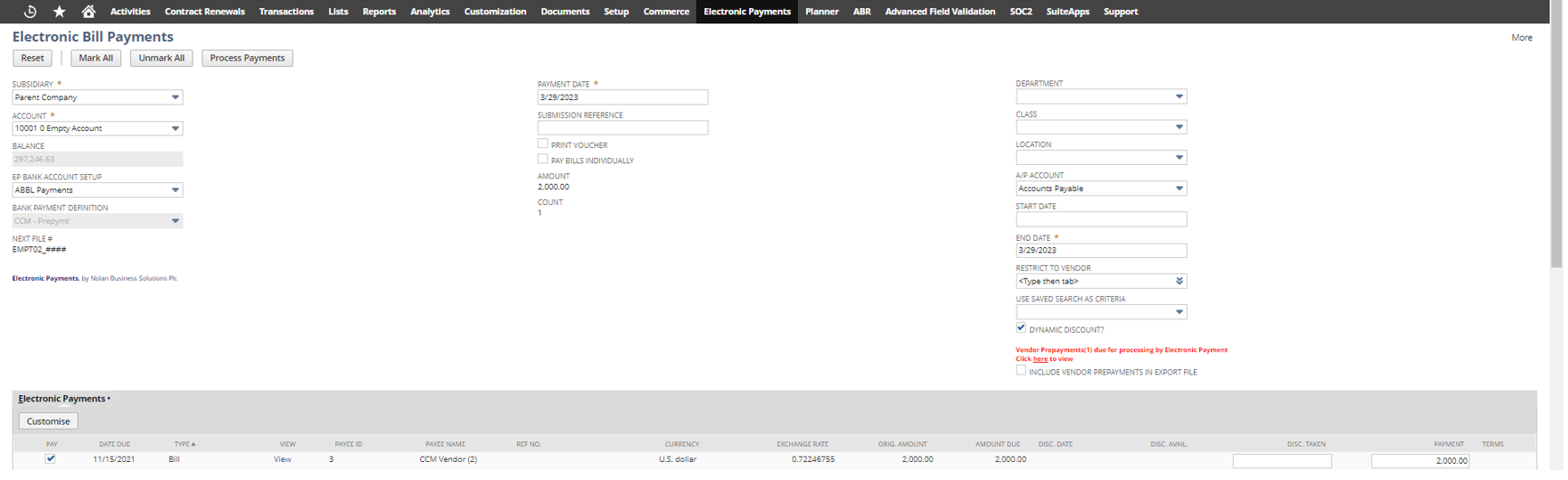 If a bill for a vendor marked for electronic payment is paid via the Pay Single Vendor page, the field Payment Method (EP) on the bill payment will default to To Pay By Check. Select To Pay By Electronic Payment to include the bill payment in the next file created.