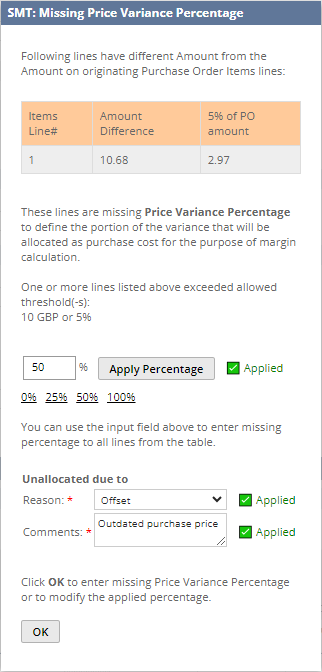 The portion of the difference is determined by the Price Variance Percentage that must be entered into Price Variance Percentage (custcol_nbssmt_price_variance_prcntg) field on Vendor Bill line. If this percentage is missing, and SMT detects a difference, the user will get a warning (only in User Interface context) about it, where the percentage can be easily entered for all lines where it is missing.