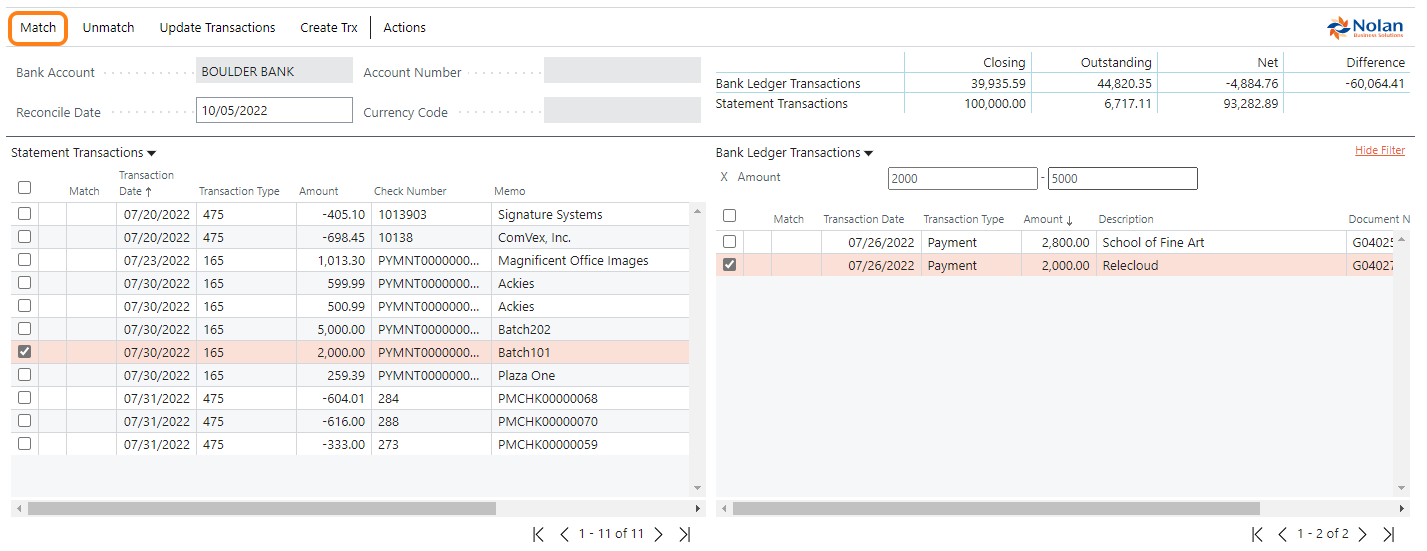 Once you are happy click the match button and you will have created a new match set. You can continue this process for multiple match sets until you are at the point where you wish to reconcile transactions off.