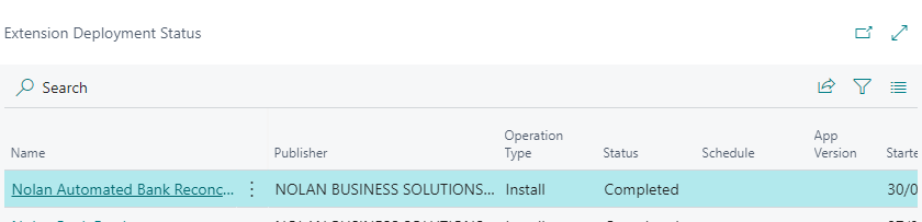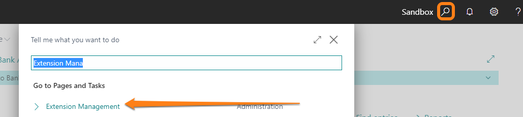 To check on the progress of a modules installation within Microsoft Dynamics 365 Business Central first locate the "Extension Management" window by searching for it: