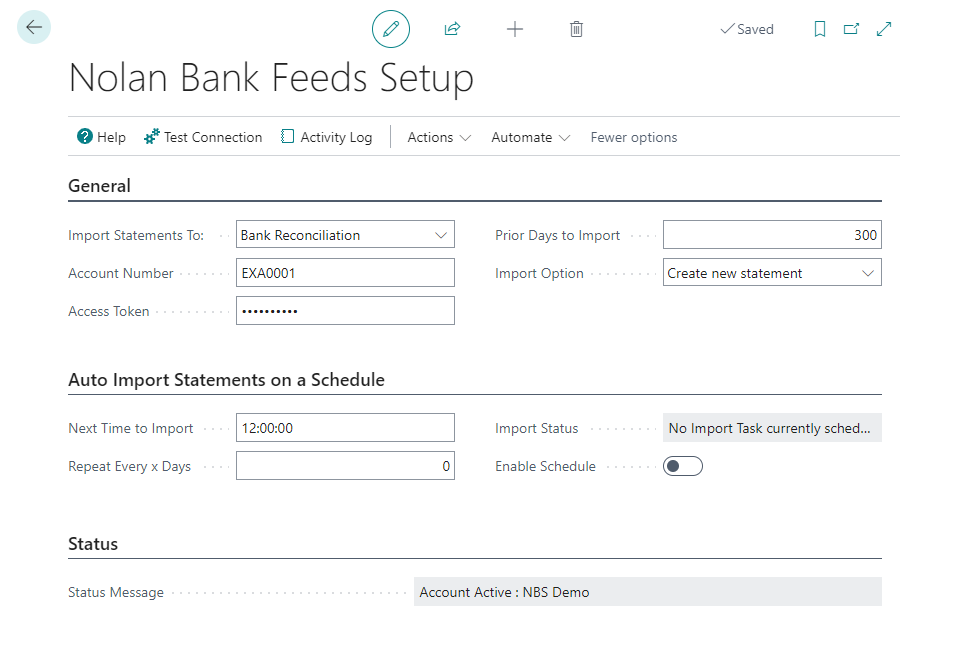 Access the bank feeds setup page in business central by searching for "Nolan Bank Feeds Setup"