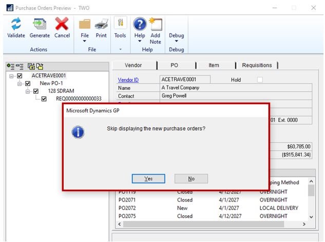 Keep the additional functionality, but save some clicks! When creating a Purchase Order with the Purchase Orders Preview window, a prompt appears to skip displaying the new purchase orders. The user can select No which directs them to a navigation list with all of the new purchase orders that they created, or select Yes, to simply print the purchase order generation report.