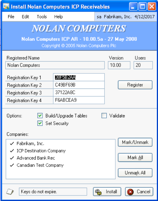 - To register Intercompany AR, enter your four 8‐digit registration keys in the fields provided (You will have received these registration keys with your purchase of Intercompany AR). This is required to enable use of Intercompany AR in companies other than the lesson company Fabrikam, Inc.