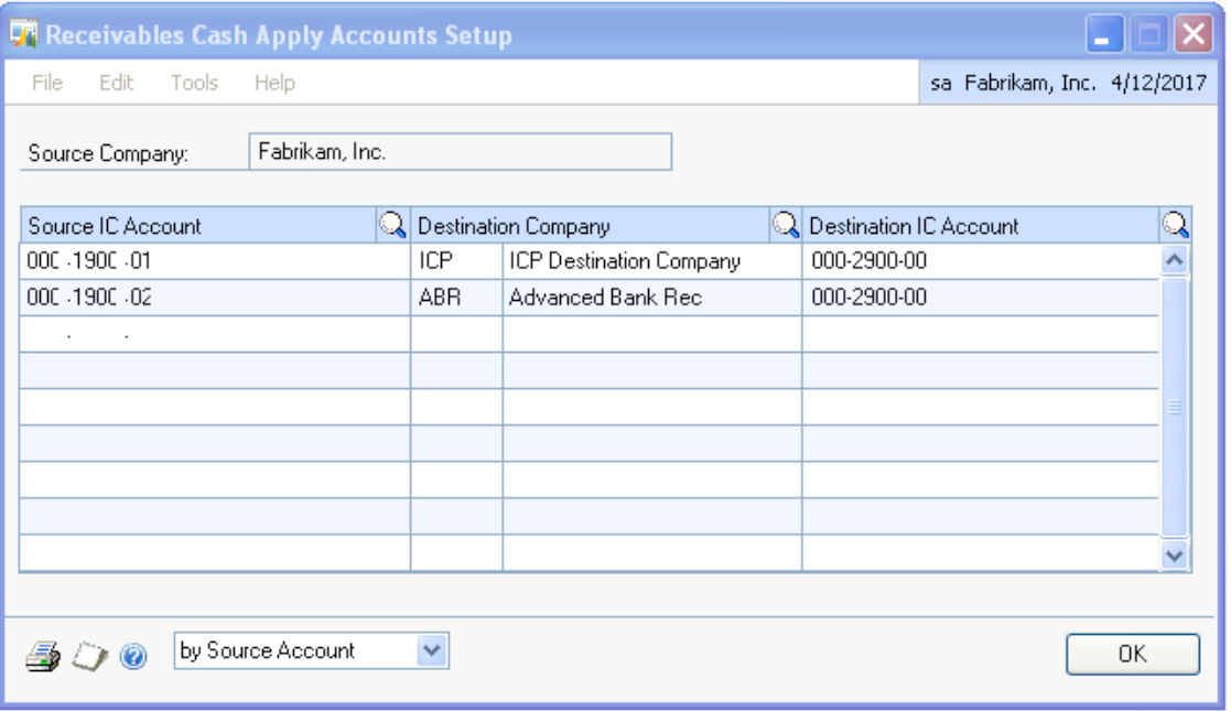 Start off by typing in or selecting the Due To account in the source company (the company that you are currently logged into). Next select a Destination Company for which you would like to apply payments on behalf of. Finally type in or select the Due From account in the destination company.