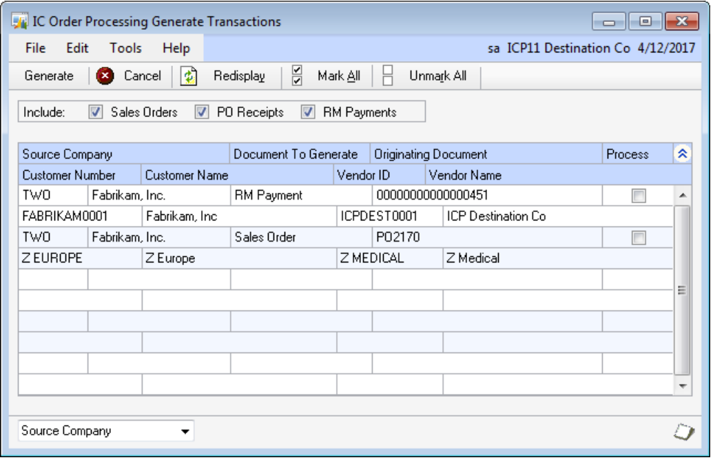 If any of the IC POPSOP setup options are set to Manual rather than Auto, the user will need to manually create the transactions in the appropriate company from the following screen. This window is also used if any transactions get stuck due to missing details in one of the companies. Once the information has been updated, the user can click Generate to create the transactions from this window.