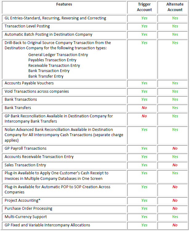 - * Project Accounting transactions are supported using the Trigger Method. However, Multi-currency Project Accounting transactions are not supported.