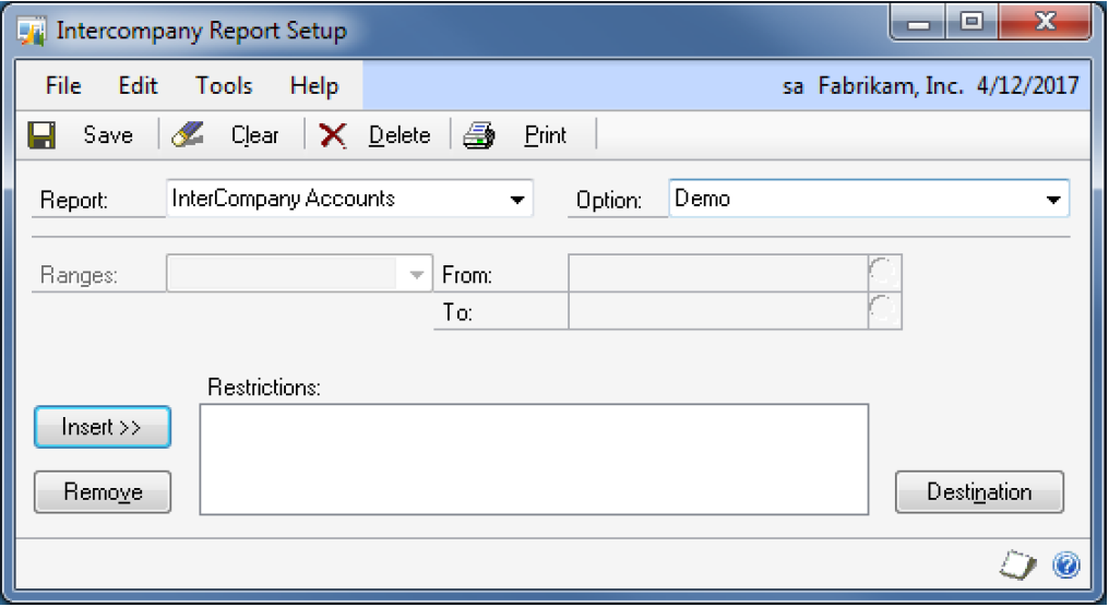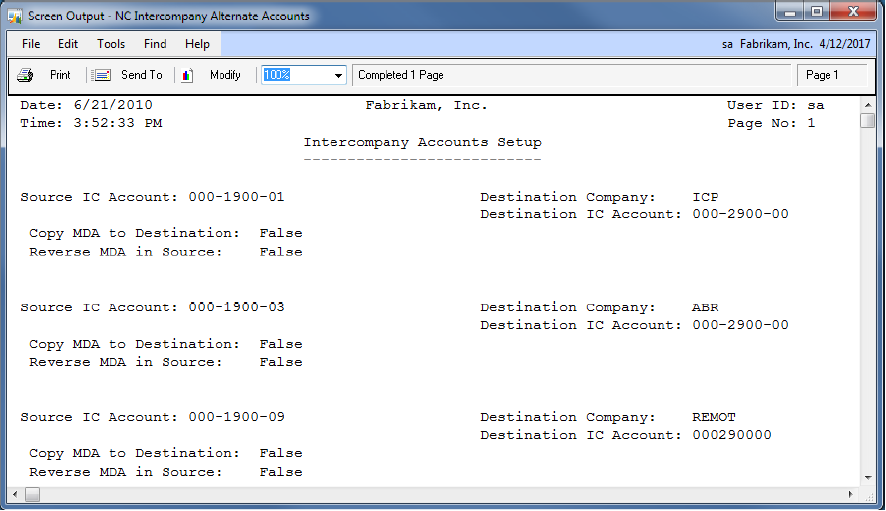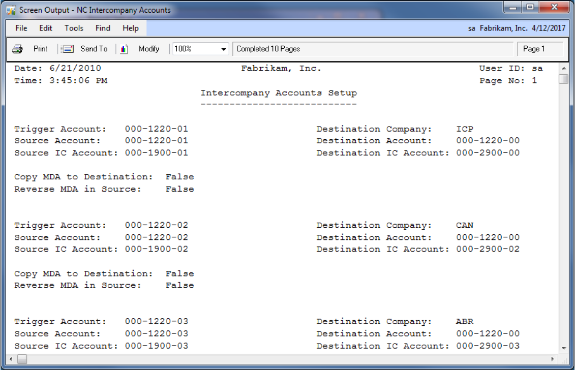 The Intercompany Accounts report prints a list of the Trigger accounts setup in the company.