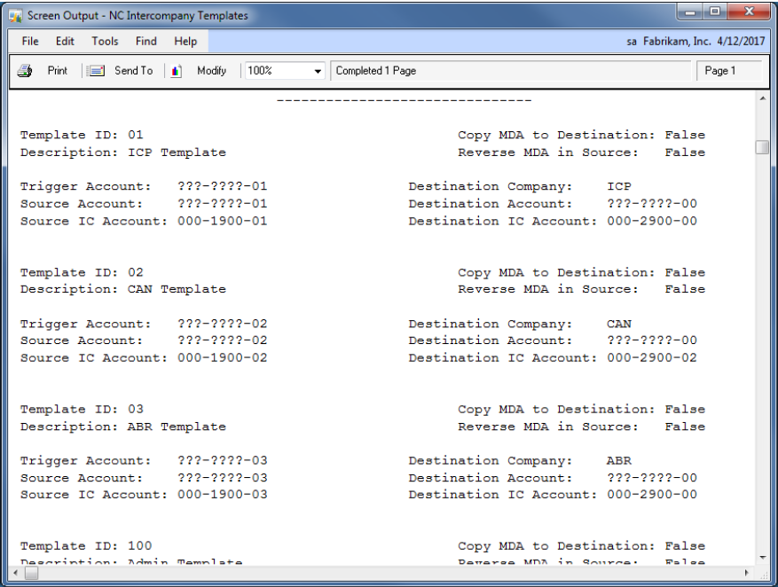 The Intercompany Templates report prints a list of the Intercompany Accounts Templates setup in the company.