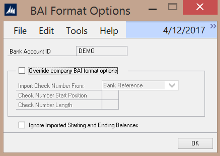 Overide company BAI Import options: This allows you to import in different reference information for different Bank IDs if one BAI statement contains multiple accounts with different information or if multiple BAI statements are used in one GP company.