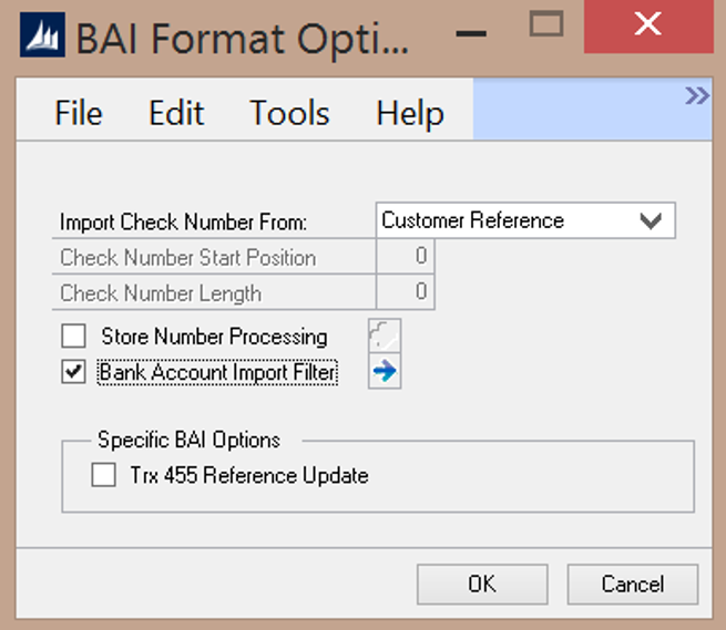 Specific BAI Options – Trx 455 Reference Update – When this is selected, different reference information will come in by all transactions with the Type of 455.