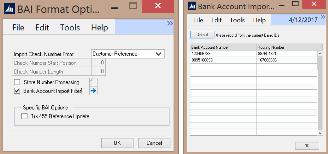 Bank Account Import Filter – Enables the ability to extract specific bank account information from the BAI and CSV import files. This functionality is useful when a single file from the bank contains data for multiple companies. (see Bank Account Import Filter for more details)