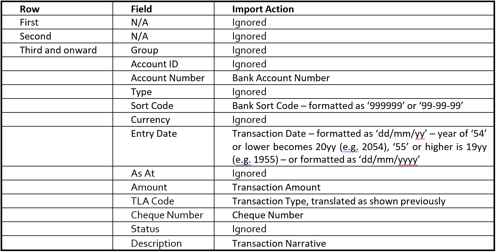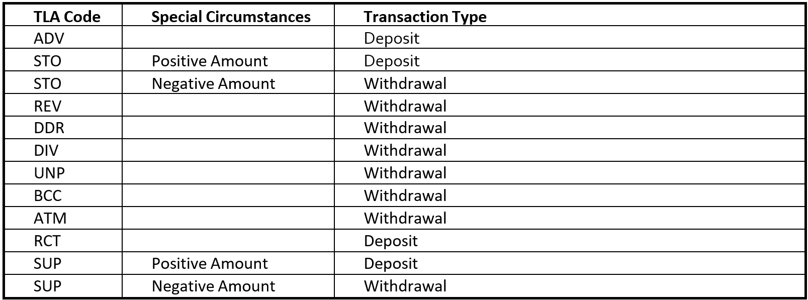 The ‘TLA Code’ field is used to identify the transaction type, as shown in the table on the following page.