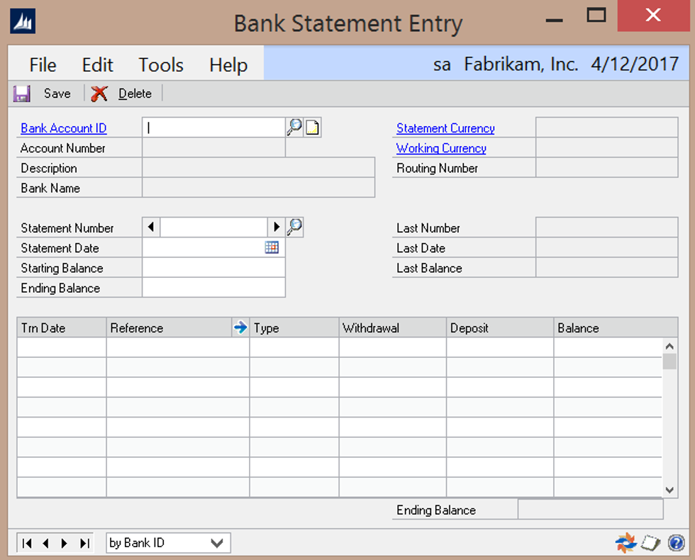 The Bank Statement Entry window is used to create/modify/delete bank statements that were entered manually or imported through the Statement Import process.