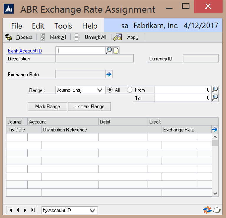 Bank Account ID – The Bank Account associated to the Exchange Rate. Description – Displays the description of the selected Bank ID. Currency ID – Displays the Currency ID for the selected Bank Account.