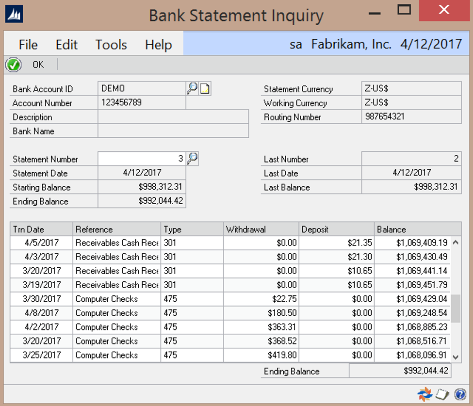 The Bank Statement Inquiry window is used to view entered/imported bank statements.