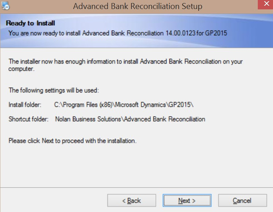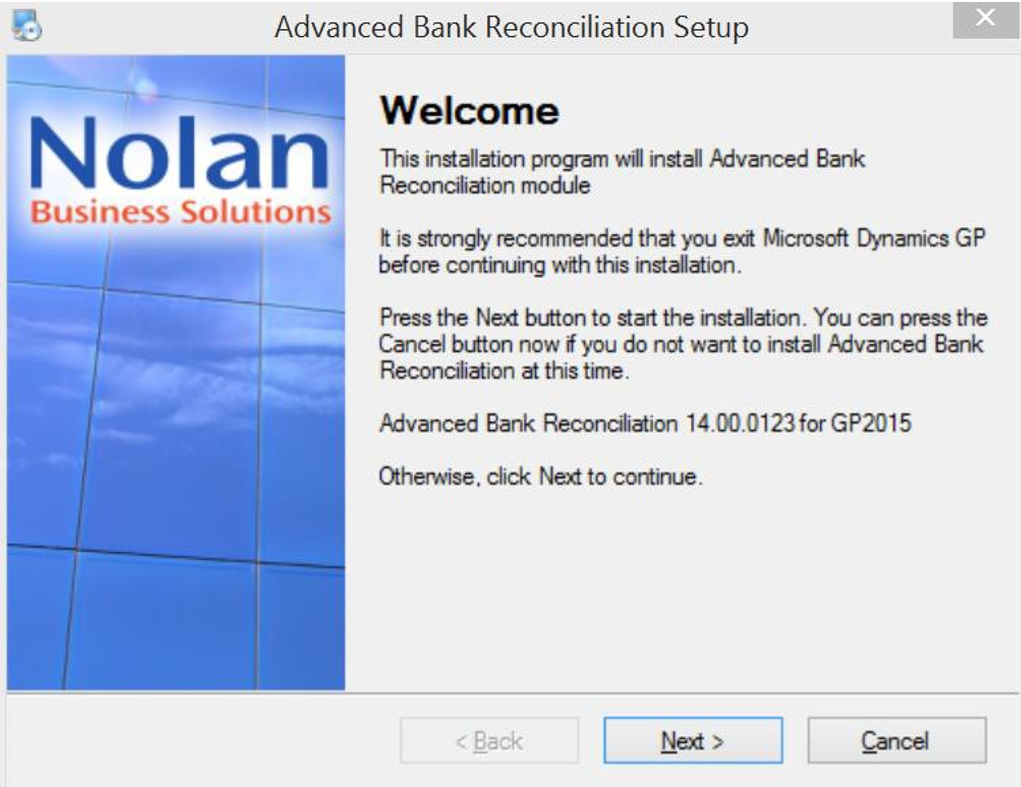 Before installing Advanced Bank Reconciliation, please ensure that there are no users logged into Dynamics GP as this could adversely affect the installation process. It is also recommended that you back up your system.