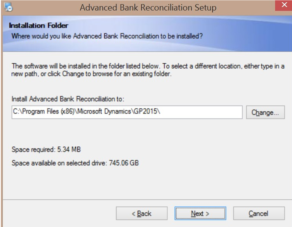 - The install will prompt for the Dynamics GP directory and will install the Advanced Bank Reconciliation chunk (cnk) file into this directory. If the default path is not correct, then click on the Browse button to navigate to the Dynamics GP directory.![]()