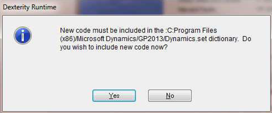 - Launch Dynamics GP to load the new ABR chunk file. Click “yes” to the “Include new code now?” prompt.![]()