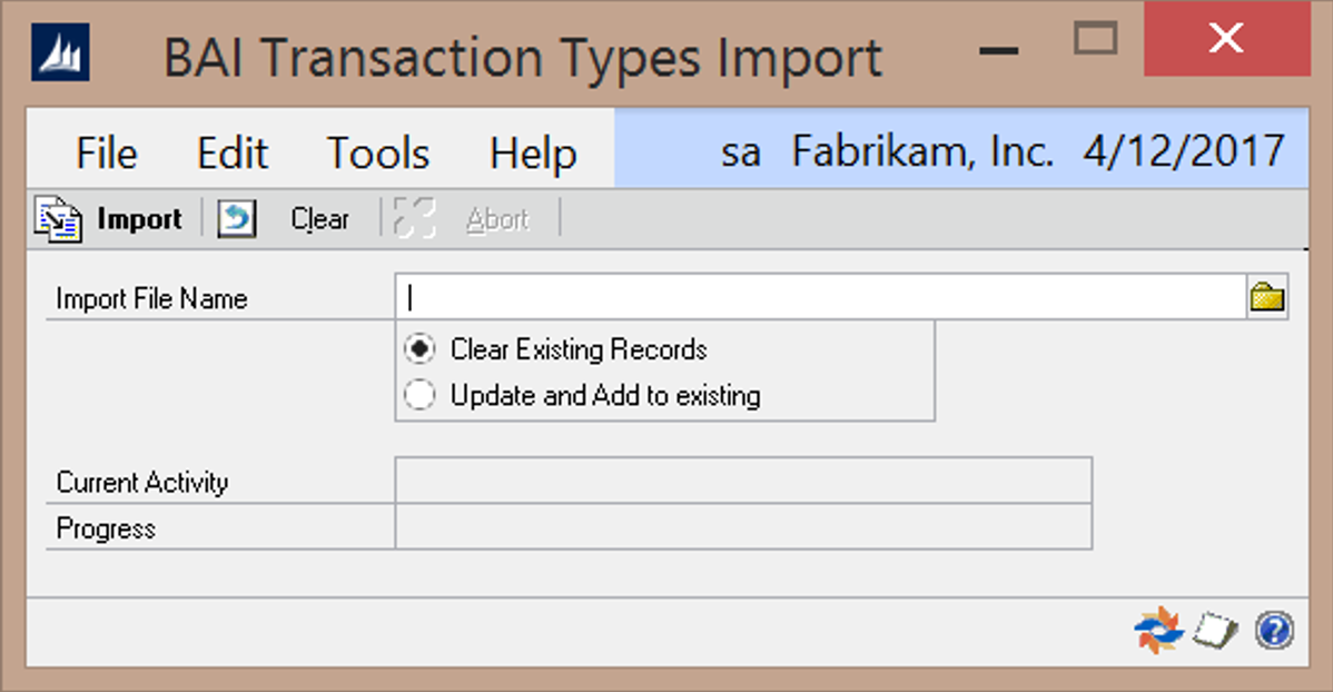 - Clear Existing Records – Clears all existing BAI Transaction Types and adds the new types contained in the Import File