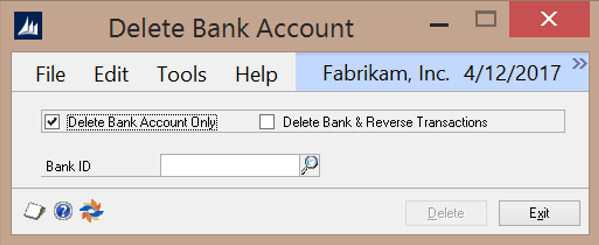 Delete Bank Account and Reverse Transactions – Removes the Bank Account and posts reversing transactions to the reconcile account, if used.