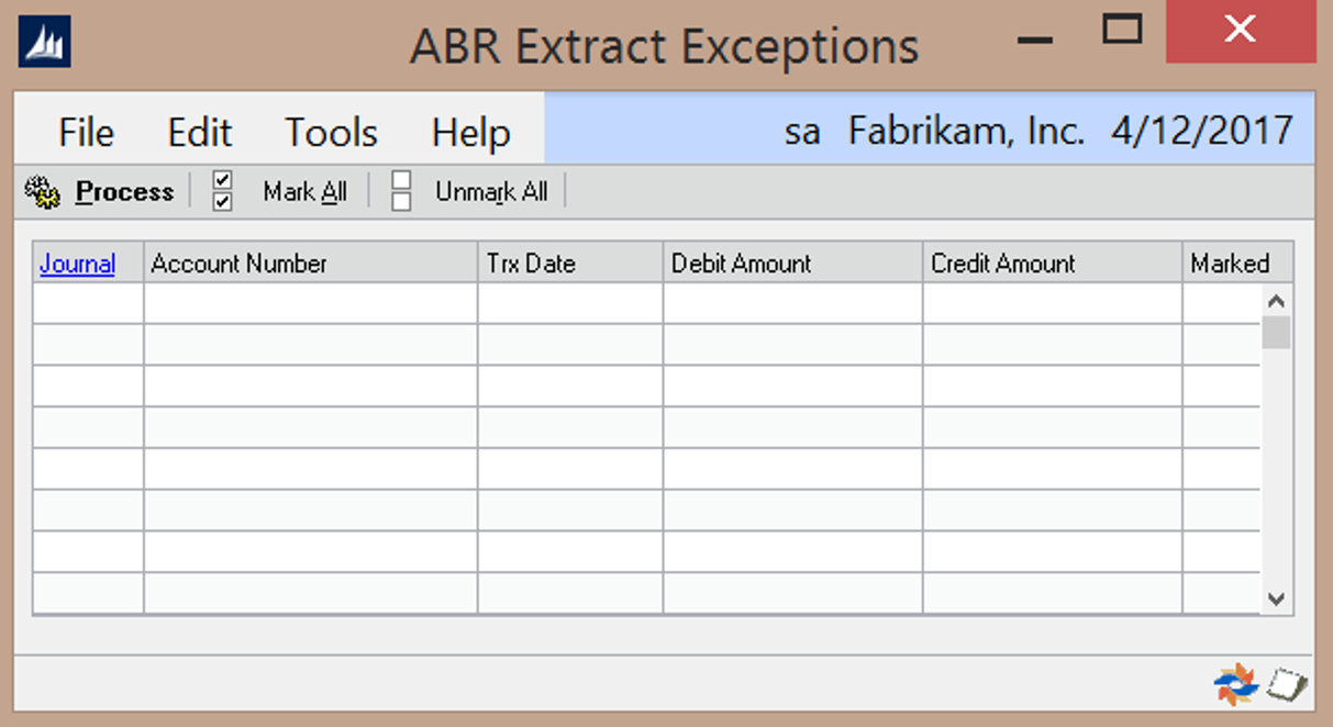 This window is used to process exception transactions. If the “Disallow and Report as Exceptions” option is selected in the ABR Setup (see ABR Extractions in the ABR Setup section above) then transactions posted in currencies other than the functional currency will appear in this screen.