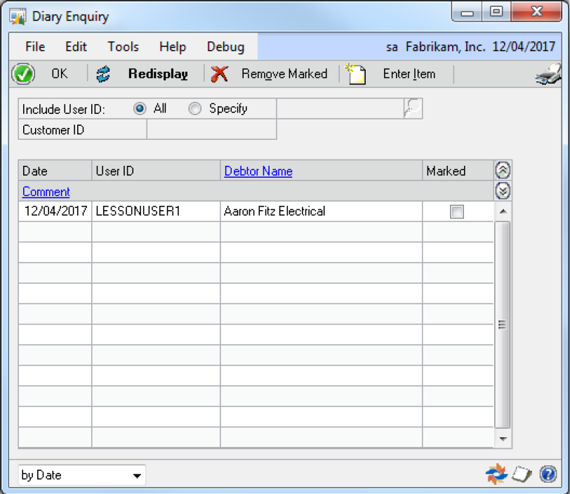 Each diary item is shown in the scrolling window, which can be sorted by date, customer and user ID. The items can be restricted to a specific user ID. To update the details of an item, zoom on the comment field to open the entry screen. New items are created using the ‘Enter Item’ button.