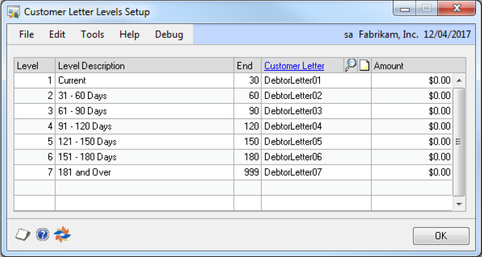 The overdue levels are equivalent to the customer ageing periods that are defined in the Microsoft Dynamics GP Receivables Management Setup window.