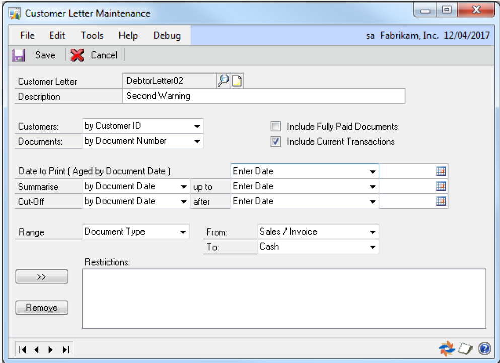 Transactions with a date after the cut-off date will be excluded from the letter processing. Transactions may be excluded by Due Date or Document Date.