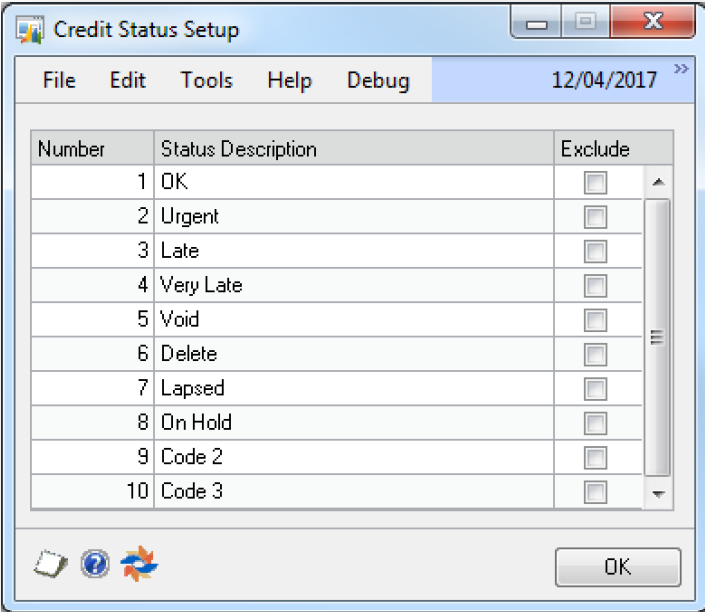 This window allows you to define 10 status levels which can then be used to categorise outstanding transactions in the Credit Control Transaction Enquiry window.