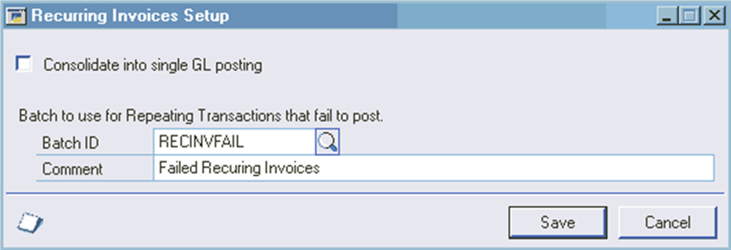The Recurring Invoices Setup window allows for the Recurring Posting Failure batch to be defined. This batch is used when a Repeating transaction fails posting to hold the failed transaction. This batch is not used for Distributed documents.